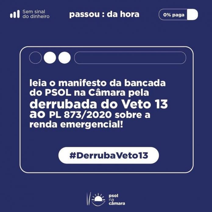 A bancada do PSOL, através do Manifesto pela Derrubada do Veto nº 13 ao PL 873/2020, expressa seu apoio aos trabalhadores, trabalhadoras e famílias brasileiras, que em razão do veto foram prejudicados e ainda encontram dificuldades no acesso à Renda Básica emergencial.