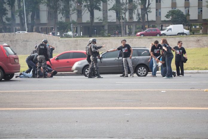 Em nota divulgada nesta quinta-feira (29), o PSOL do Distrito Federal repudia a ação truculenta da Polícia Militar do DF contra professores que participavam de manifestação na tarde desta quarta-feira (28), no Eixão, no centro de Brasília. Ao final do ato, que era parte do calendário de greve da categoria e de demais servidores que exigem do governo de Rodrigo Rollemberg o pagamento da última parcela do reajuste salarial, que deveria ter sido paga em setembro, com base em acordo firmado em 2013, policiais agrediram pelo menos uma dezena de professores, em pleno Dia do Servidor Público. Alguns também foram levados para a delegacia, sem qualquer justificativa.